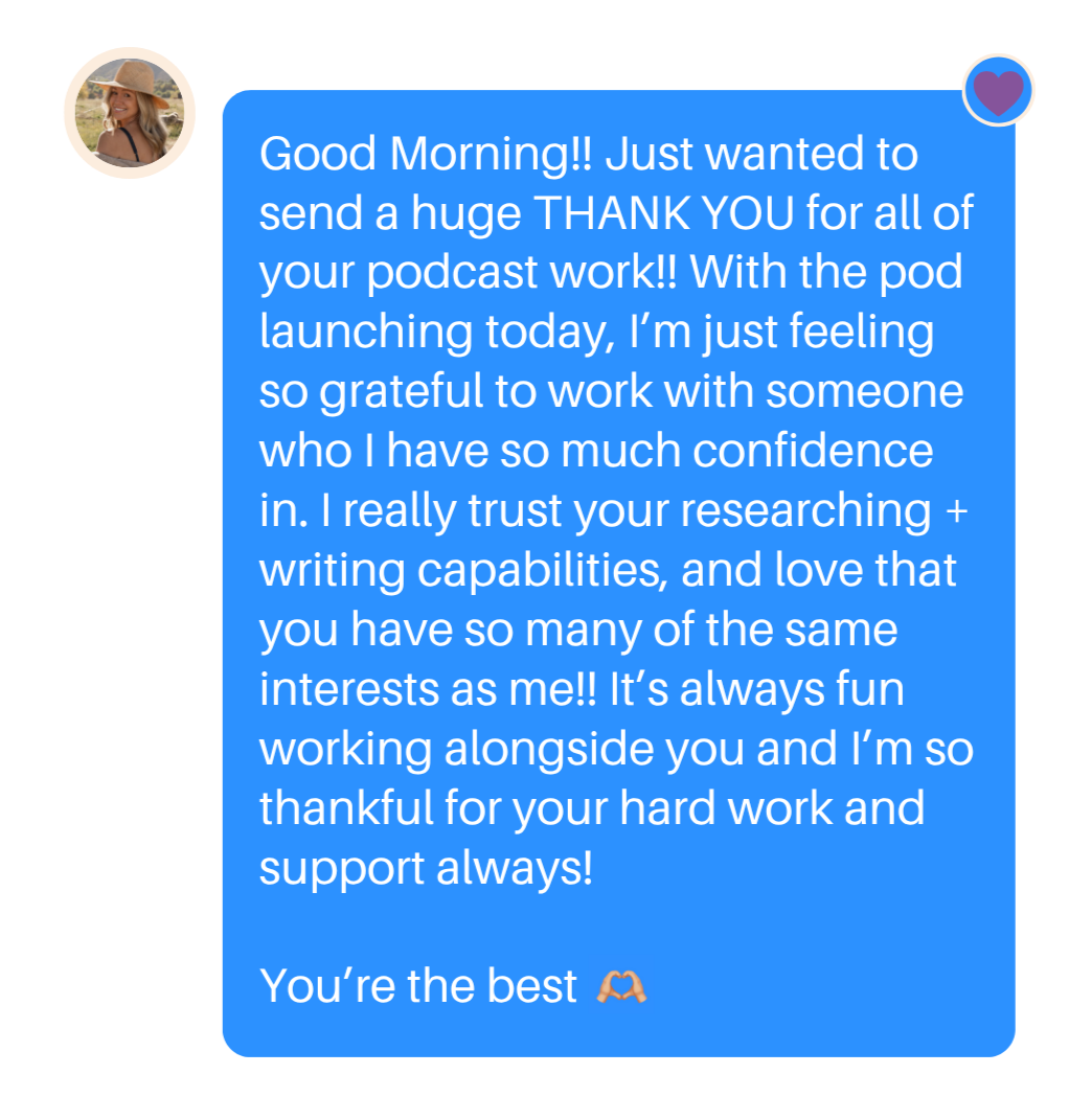 I provide full-spectrum podcast support — from concept, to copy, to celebration.